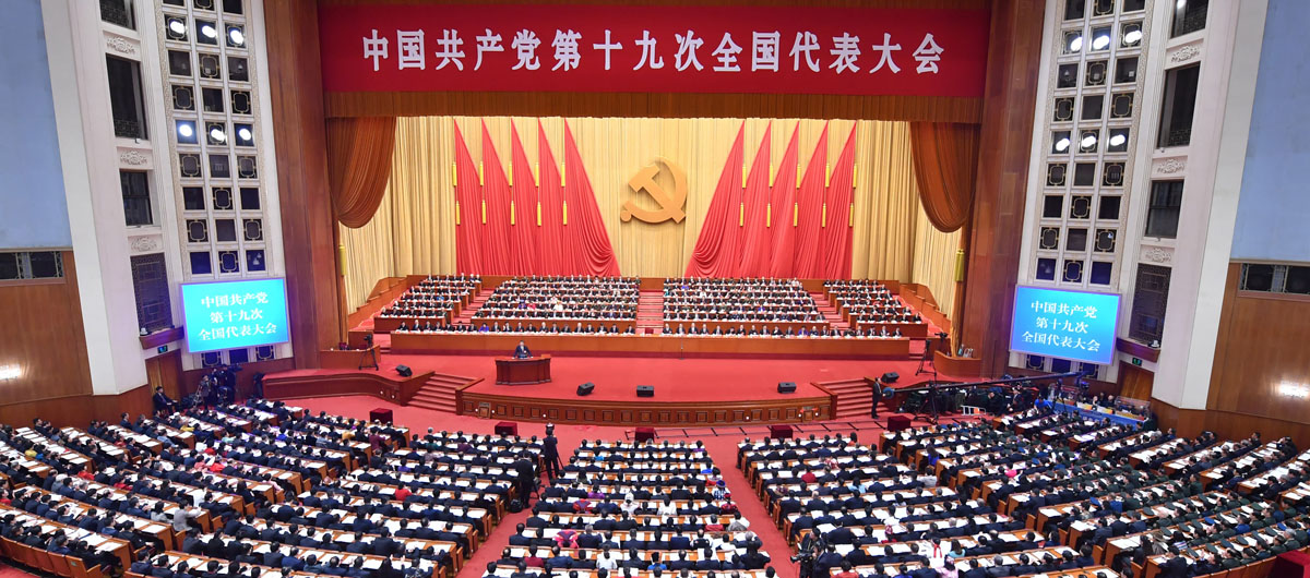 人民大会堂雄伟庄严,万人大礼堂气氛热烈。主席台上方悬挂着“中国共产党第十九次全国代表大会”的会标,后幕正中是镰刀和锤头组成的党徽,10面鲜艳的红旗分列两侧。二楼和三楼眺台上分别悬挂着“不忘初心,牢记使命,高举中国特色社会主义伟大旗帜,决胜全面建成小康社会,夺取新时代中国特色社会主义伟大胜利,为实现中华民族伟大复兴的中国梦不懈奋斗!”“伟大、光荣、正确的中国共产党万岁!”的横幅。