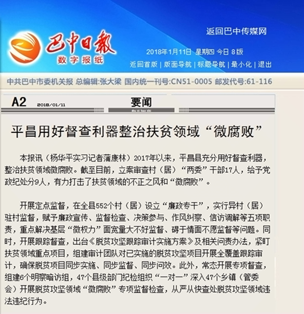 2017年以来,平昌县充分用好督查利器,整治扶贫领域微腐败。截至目前,立案审查村(居)“两委”干部17人,给予党政纪处分9人,有力打击了扶贫领域的不正之风和“微腐败”。